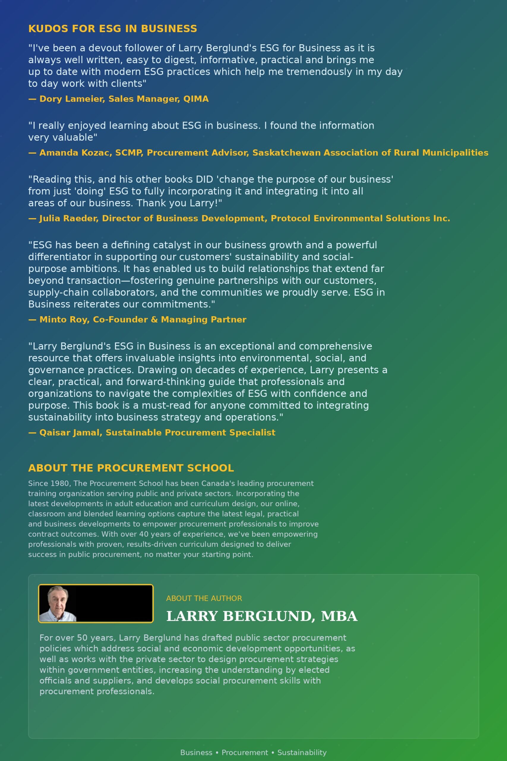 Don't miss the opportunity to enhance your ESG skills with this indispensable guide. Purchase "Procurement School presents ESG in Business: How Environmental, Social and Governance Practices are Changing the Purpose of Business" and take the next step in your professional development.